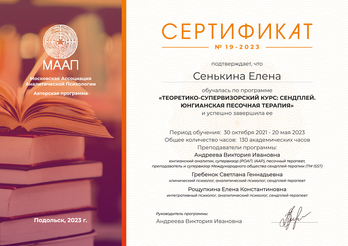 Закончила курс «Аналитическая психология и психотерапия», 2013-2016, Московская ассоциация аналитической психологии, региональная программа г. Подольск.